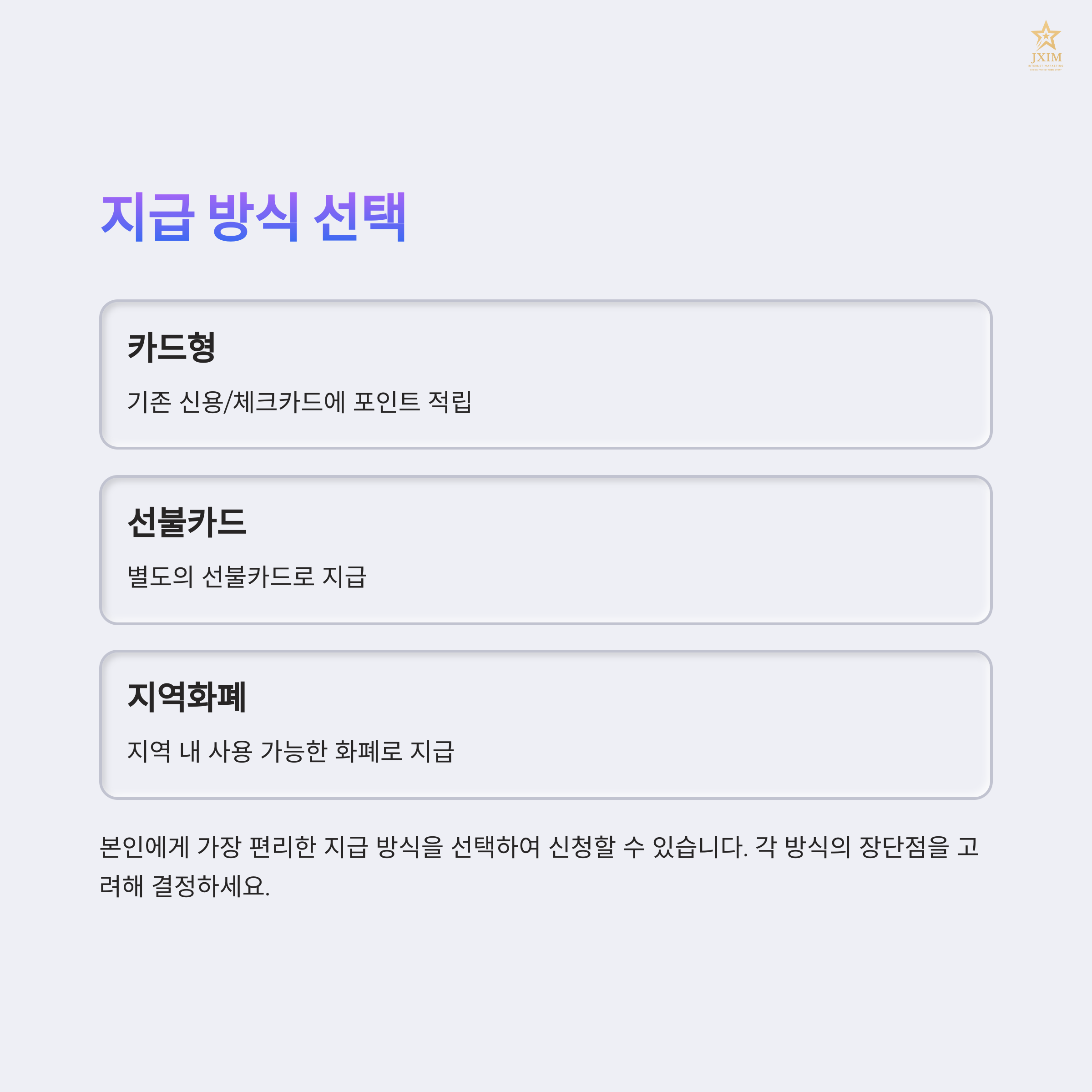 이번 민생회복지원금은 카드형(신용·체크), 선불카드, 지역사랑상품권(지역화폐) 중 선택해서 받을 수 있어요. 신청 방법은 아래 표를 참고해 보세요.