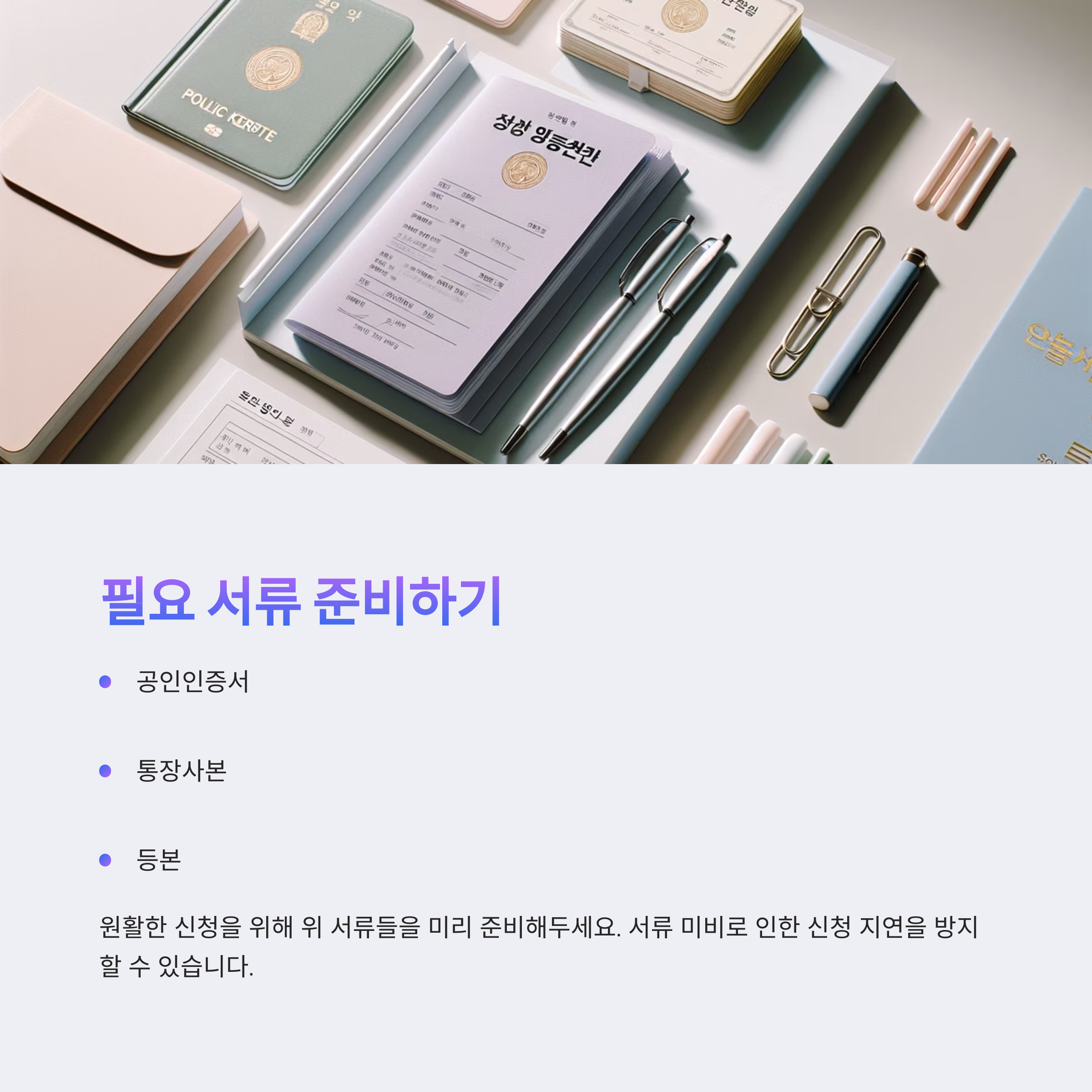 헷갈리고 복잡한 건 싫잖아요? 그래서 미리 준비하면 좋은 서류와 절차를 정리해 봤어요. 준비물만 챙겨두면 신청일 당일에도 무리 없이 완료 가능해요!