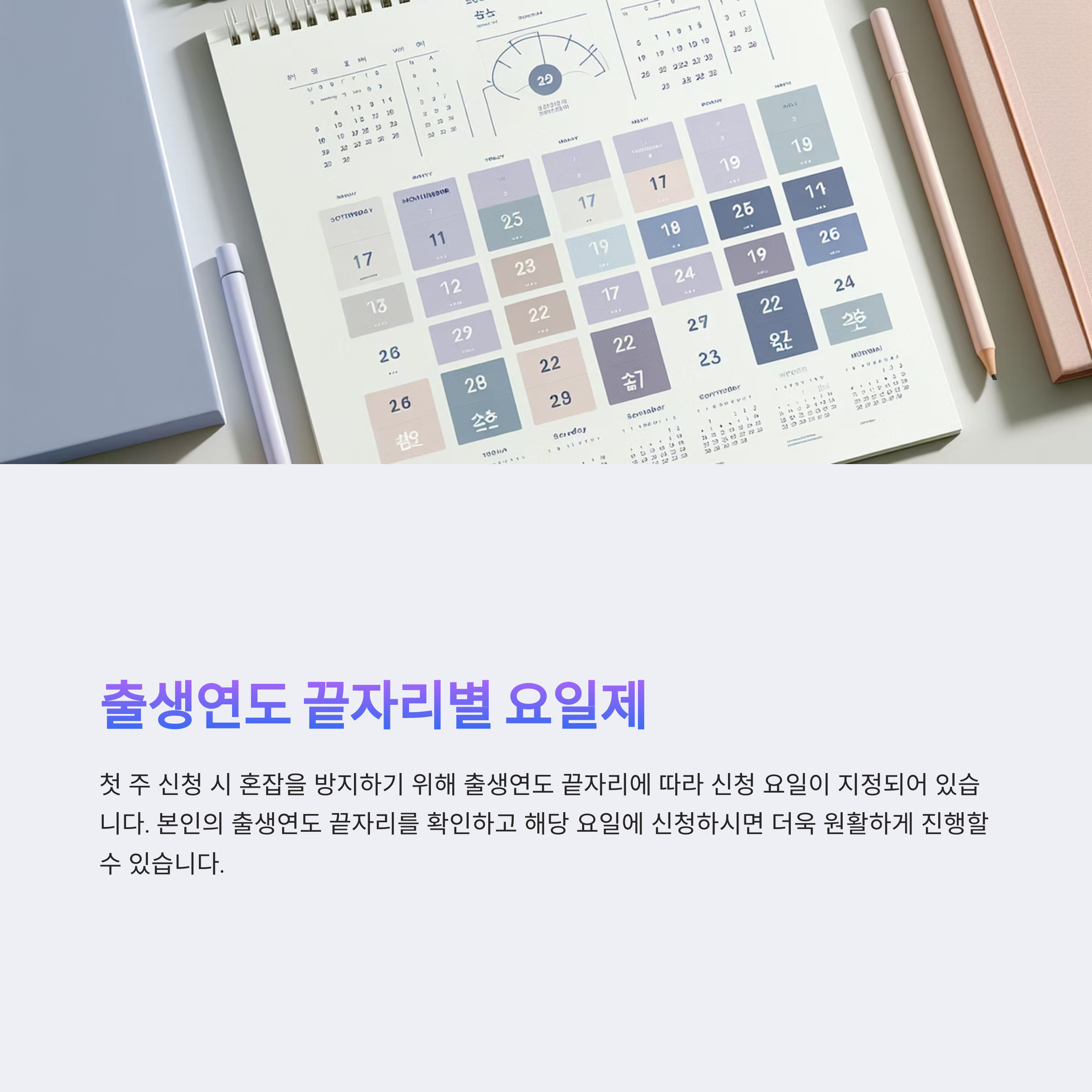 신청 시작 첫 주에는 ‘출생연도 끝자리 요일제’가 적용돼요. 즉, 출생연도에 따라 신청할 수 있는 요일이 정해져 있다는 뜻이죠. 아래 표를 참고해 신청일을 헷갈리지 마세요.