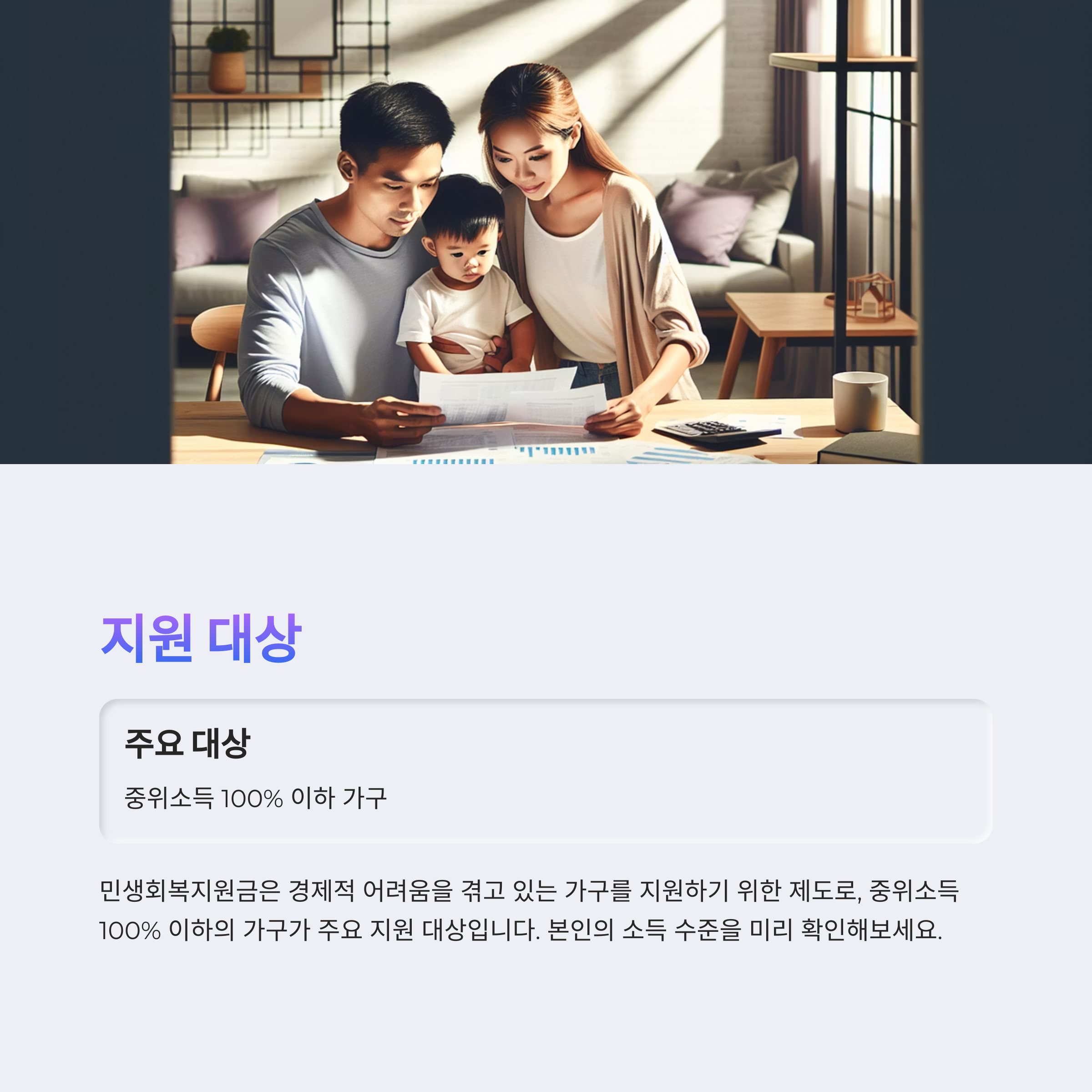 - 중위소득 100% 이하 가구 (4인 기준 약 540만 원 이하)
